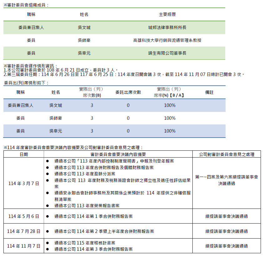 本公司審計委員會由全體獨立董事組成,每季至少召開會議乙次,並得視需要隨時召開。自108.6.21股東會全面改選董事會後,原監察人制度由審計委員會取代。