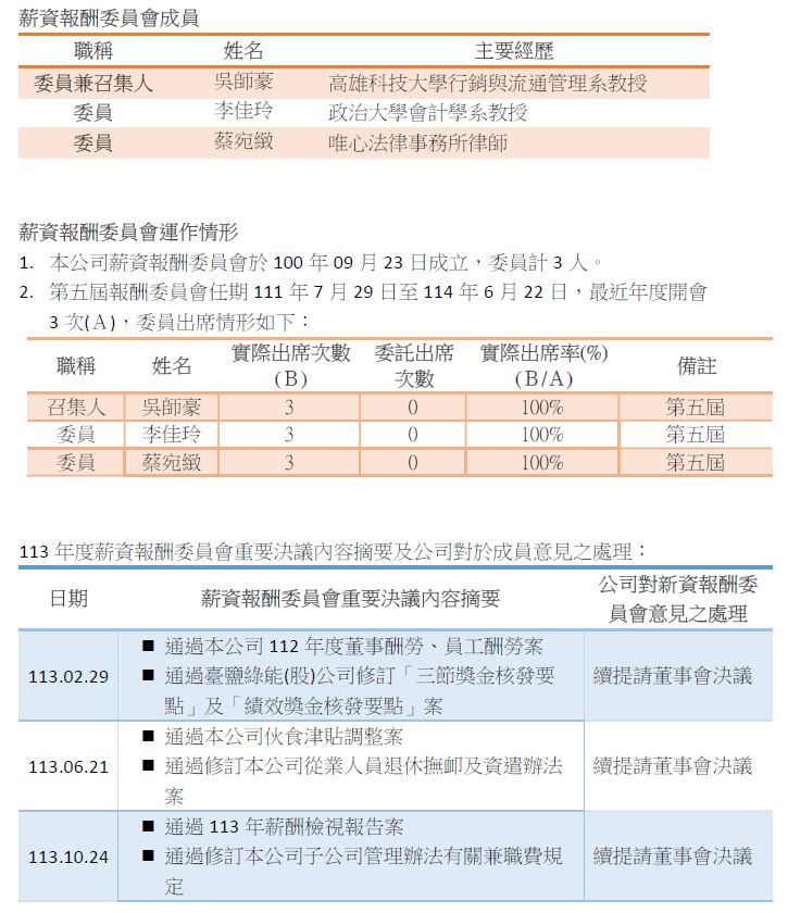 1. 訂定並定期檢討董事、監察人及經理人績效評估與薪資報酬(含董事、監察人之車馬費)之政策、制度、標準與結構。