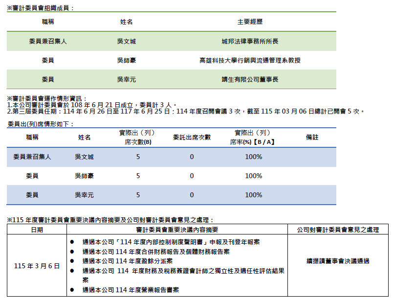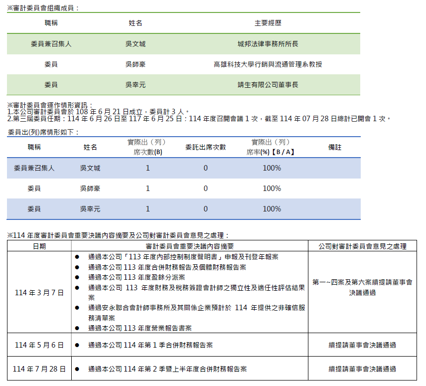 本公司審計委員會由全體獨立董事組成,每季至少召開會議乙次,並得視需要隨時召開。自108.6.21股東會全面改選董事會後,原監察人制度由審計委員會取代。