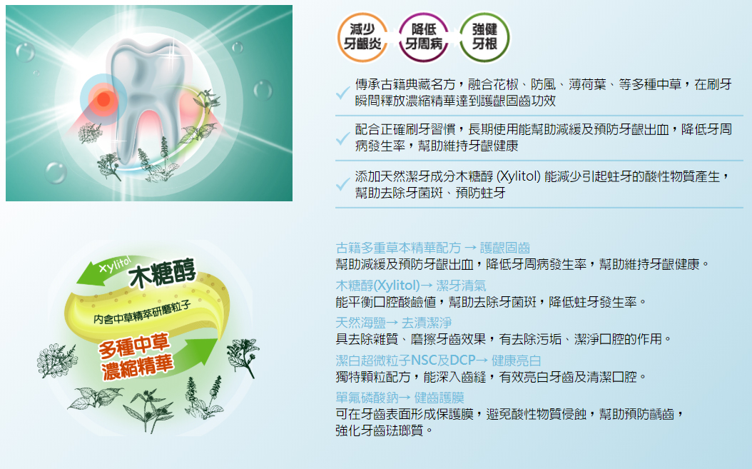 传承古籍典藏名方,融合花椒、防风、薄荷叶、旱莲草、生地黄、白蒺藜、香附、没食子等多种中草,在刷牙瞬间释放浓缩精华,清热去火、护龈固齿,配合正确刷牙习惯,长期使用能帮助减缓及预防牙龈出血,降低牙周病发生率,帮助维持牙龈健康达到牙根强健;另添加天然洁牙成分『木糖醇 (Xylitol) 』,能减少引起蛀牙的酸性物质产生,帮助去除牙菌斑、预防蛀牙,并能平衡口腔酸硷值,防止珐琅质被侵蚀,使牙齿牙龈更健康。