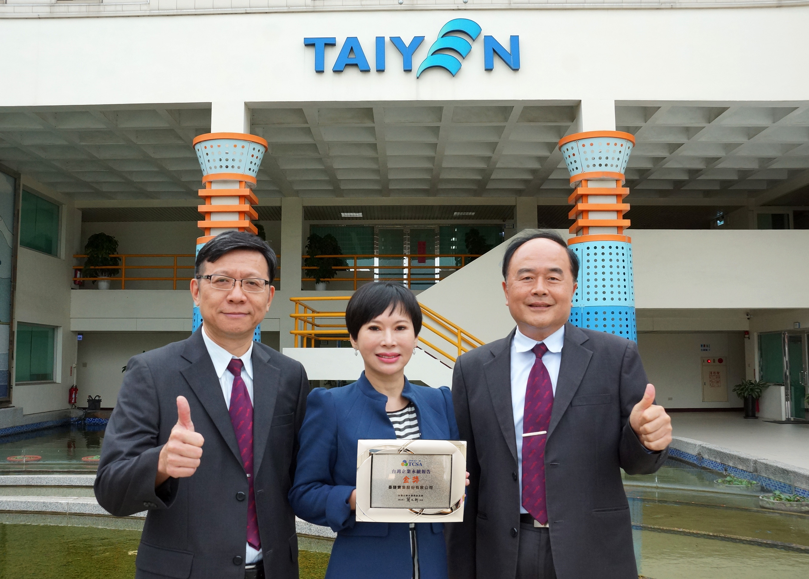 臺鹽總經理吳旭慧(中)與副總經理蘇詒良(右)、陳世輝(左)率領團隊蟬聯「2018 TCSA台灣企業永續獎」之「企業永續報告」金獎,展現永續企業的決心。
