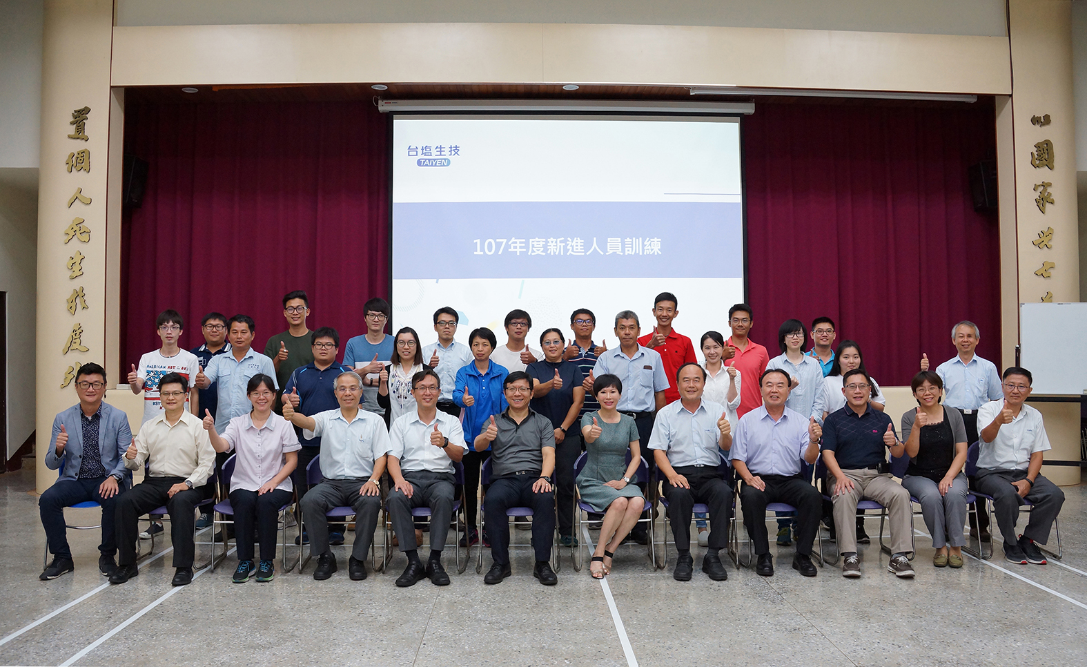 臺鹽重視員工發展,總經理吳旭慧(前排右六)與一級主管參與新進員工訓練,凝聚向心力。