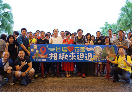 ↑臺鹽新裝鹽品上市,由全美戲院負責人吳俊漢(右四)、國寶級看板畫師顏振發(右三)、台南市社會大學老師蘇芳純(左三)、臺鹽總經理吳旭慧(左四)請大家選擇臺鹽。