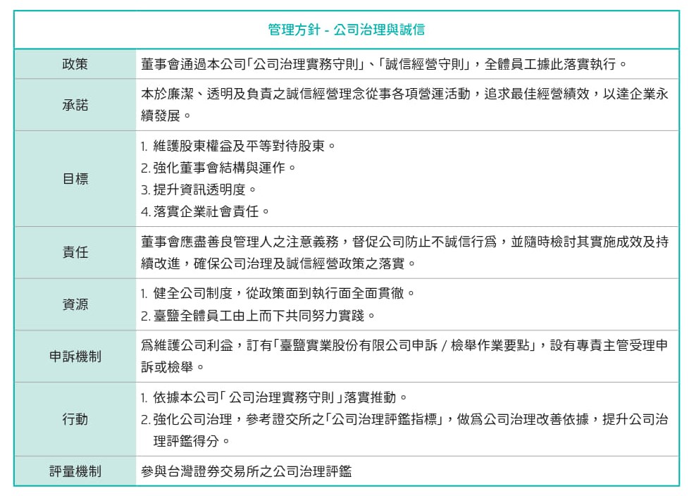 臺鹽的公司治理核心係由一群專業管理人、明確規範的相關內部章程,以及經驗傳承的企業文化所構成,秉持永續與誠信的精神執行經營決策。同時,董事會也已於 2015 年 7 月董事會審議通過「臺鹽實業股份有限公司企業社會責任實務守則」,除在本業追求發展之外,更致力於公司治理,並且與各方利害關係人保持良好互動,善盡企業社會責任,追求臺鹽的永續未來。
