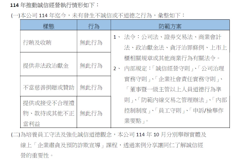 誠信經營 為落實誠信經營政策,防範不誠信之行為,本公司訂有「誠信經營守則」、「公司治理實務守則」、「企業社會責任實務守則」、「董事暨一級主管以上人員道德行為準則」、「防範內線交易之管理辦法」、「內部控制制度」、「員工守則」、「申訴/檢舉作業要點」等規定,並公告於公司內部或外部網站中。 本公司為健全誠信經營之管理,由行政處負責誠信經營政策與防範方案之制定及監督執行,並定期於每年年底前向董事會報告。