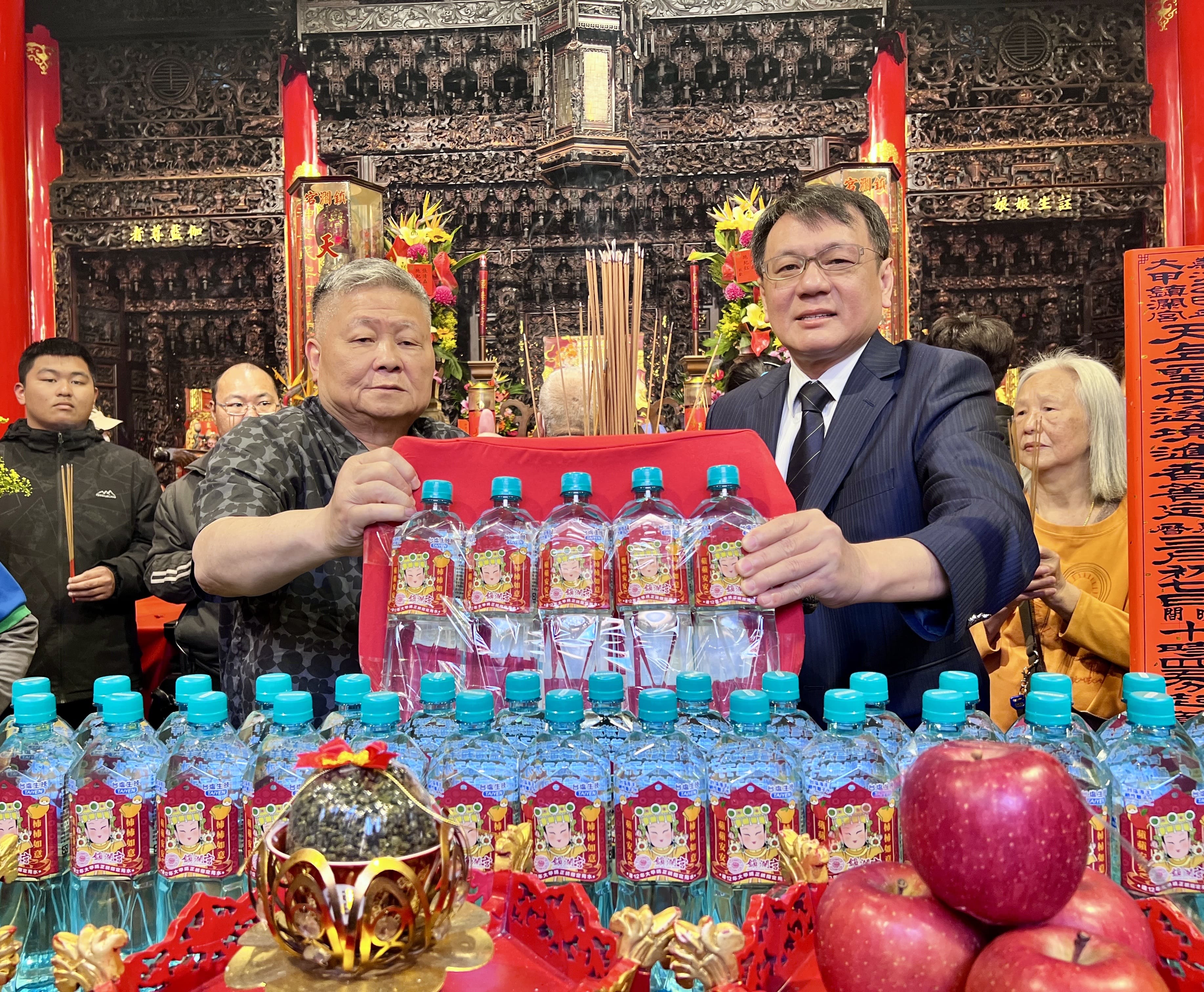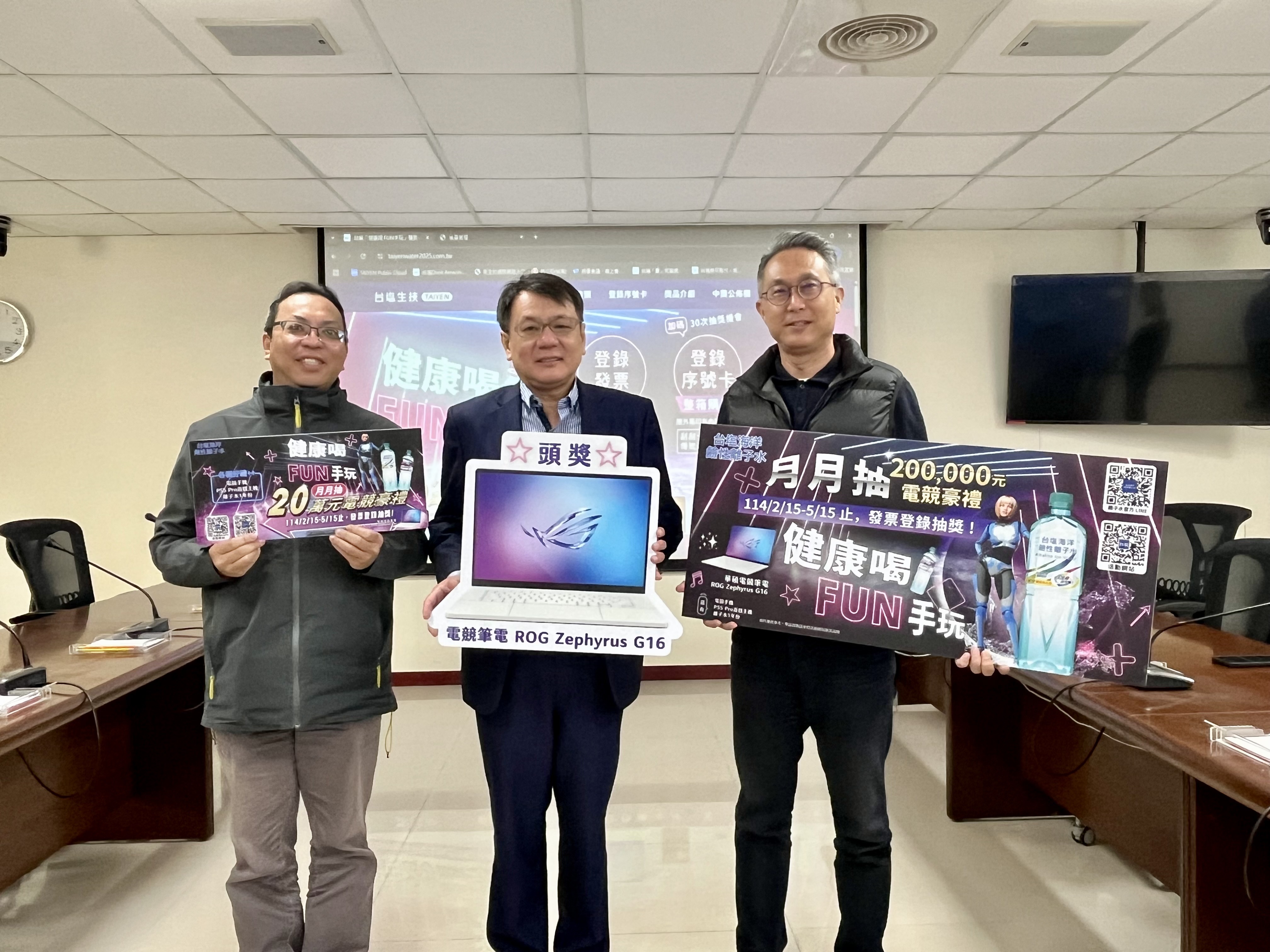 台塩海洋鹼性離子水月月抽電競逸品,由臺鹽公司董事長丁彥哲(中)抽出首波幸運得主!