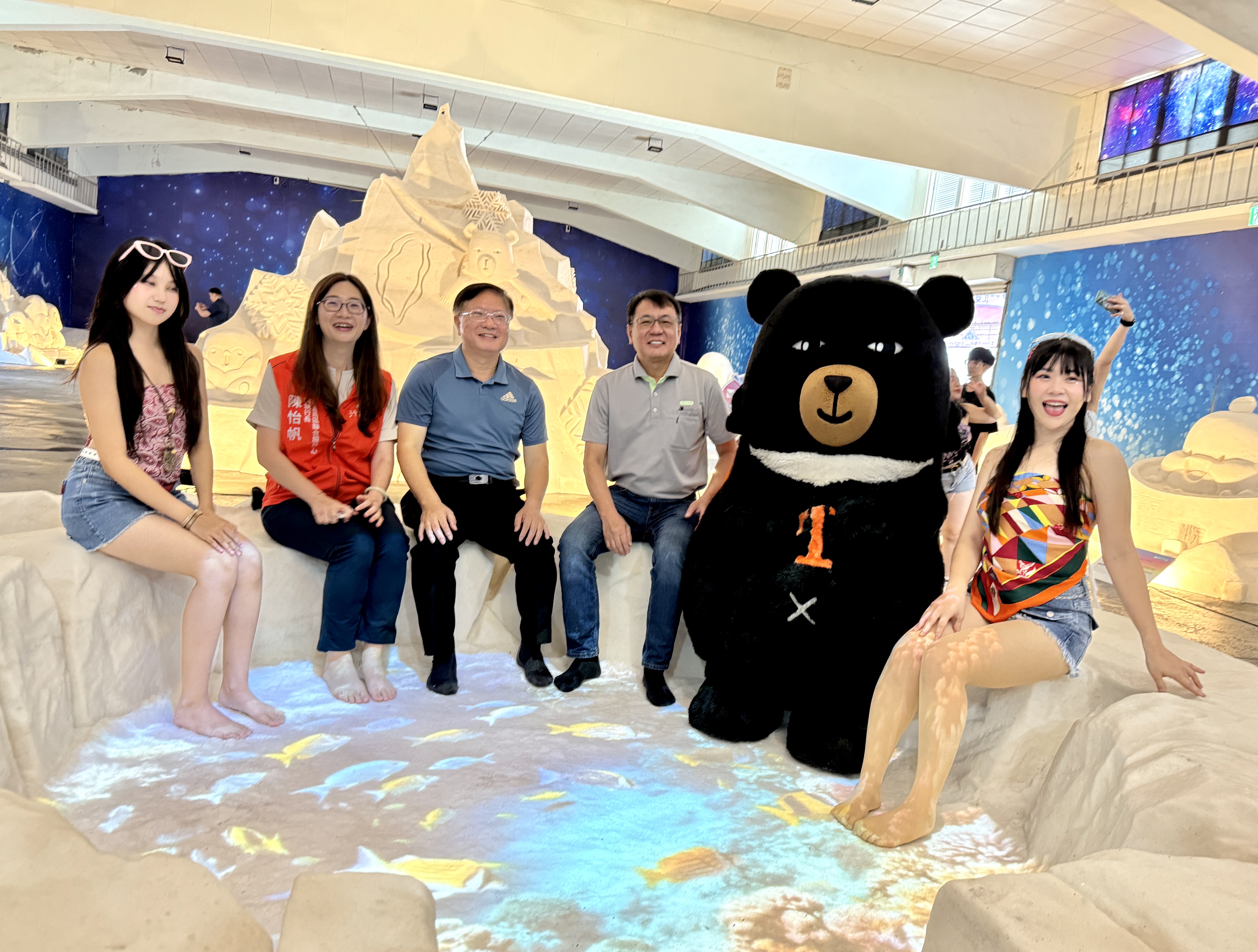 七股鹽山「一見雙雕」之「鹽味泡腳池」精彩亮相,雲嘉南區聯合服務中心副執行長陳怡帆(左二)、雲管處處長徐振能(左三)、臺鹽董事長丁彥哲(右三)與喔熊誠邀民眾前來一睹為快!