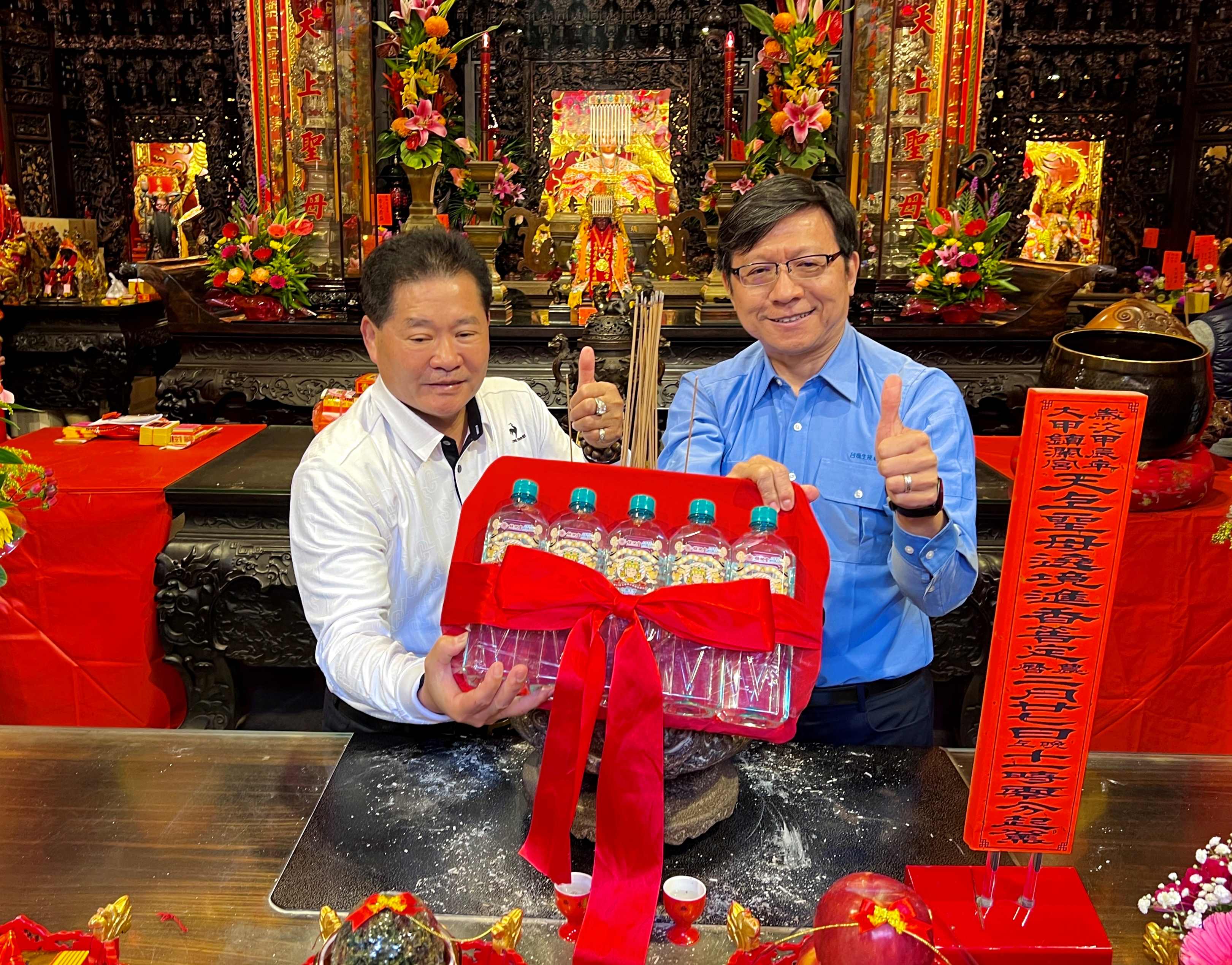 臺鹽通霄精鹽廠劉鴻泉廠長(左),代表臺鹽公司贊助台塩海洋生成水作為白沙屯媽進香用水,並邀民眾順遊「臺鹽通霄觀光園區」。