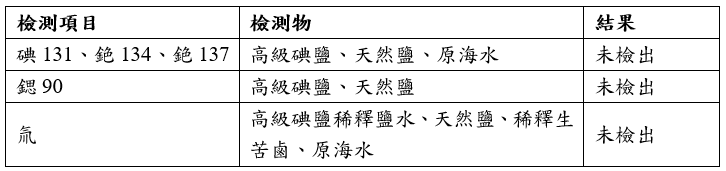 本公司持續關注原能會監測的數值,積極監控海域水質狀況,相關產品包括澳洲進口天然鹽原料,均送樣至原能會檢測碘、銫、鍶及氚放射性元素,最新送驗產品均無檢出(詳見下表)。