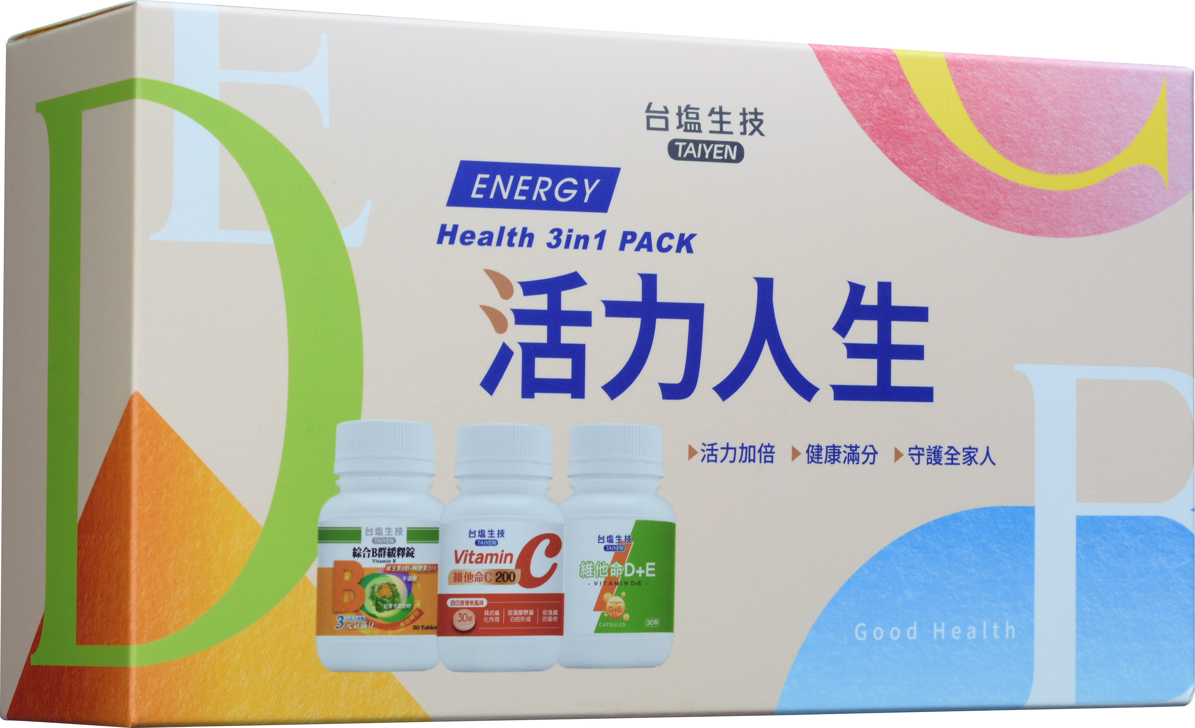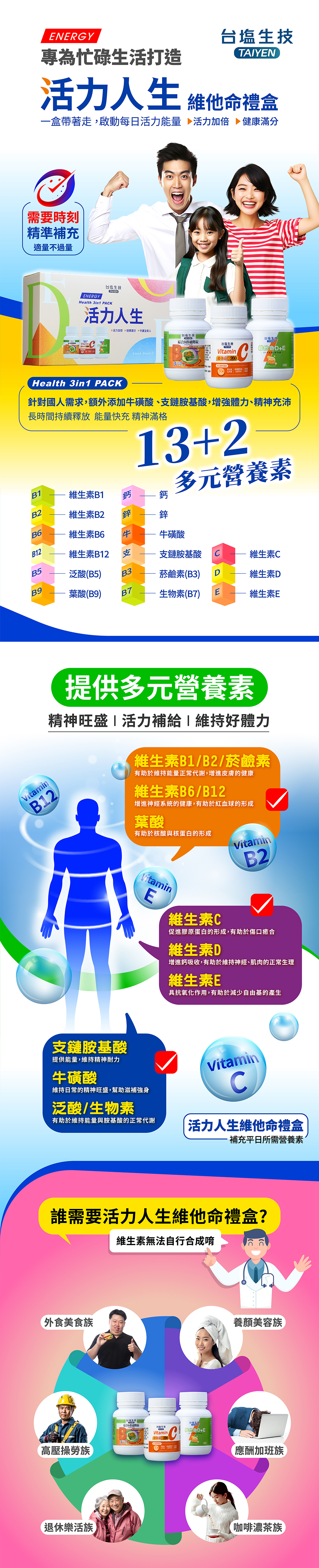 綜合B群緩釋錠:支鏈胺基酸(L-白胺酸、L-異白胺酸、L-α胺基異戊酸、卵磷脂)、羥丙基甲基纖維素、乳糖、菸鹼醯胺、維生素B6、維生素B1、牛磺酸(牛磺酸、二氧化矽)、維生素B2、微結晶狀α-纖維素、聚乙烯吡咯烷酮、膜衣(聚乙烯醇、滑石粉、二氧化鈦、脂肪酸甘油酯、食用黃色四號鋁麗基、硫酸月桂酯鈉、氧化鐵、食用黃素五號鋁麗基、食用紅色四十號鋁麗基)、本多酸鈣、麥芽糊精、二氧化矽)、硬肢酸鎂、維生素B12(甘露醇、維生素B12)、生物素(麥芽糊精、生物素)、葉酸。 維他命C200咀嚼錠:麥芽糊精、西印度櫻桃果汁粉(砂糖、麥芽糊精、西印度櫻桃濃縮汁、檸檬酸、檸檬酸鈉、蘋果酸、香料、維生素C、紅甜菜汁、婀娜多色素、β-胡蘿蔔素)、葡萄糖、抗壞血酸、乳糖、抗壞血酸鈉、玉米來源可溶性纖維、紅葡萄果汁粉(砂糖、紅葡萄果汁粉、辛烯基丁二酸鈉澱粉、檸檬酸、玉米澱粉、葡萄香料、檸檬酸鈉、葡萄果皮色素)、β-胡蘿蔔素(乾燥葡萄糖漿、阿拉伯膠、中鏈三酸甘油酯、蔗糖、L-抗壞血酸鈉(抗氧化劑)、β-胡蘿蔔素、二氧化矽、生育醇(維生素E)(抗氧化劑))、硬脂酸鎂、二氧化矽、蔗糖素(甜味劑) 維他命D+E膠囊:玉米澱粉、膠囊(明膠、純水、二氧化鈦、硫酸月桂酯鈉、甘油、食用黃色五號、食用黃色四號)、葡萄糖酸鋅、維生素E(維生素E、辛烯基丁二酸鈉澱粉、二氧化矽)、硒酵母、維生素D3(辛烯基丁二酸鈉澱粉、蔗糖、L-抗壞血酸鈉(抗氧化劑)、中鏈三酸甘油酯、二氧化矽、維生素E(抗氧化劑)、維生素D3)、硬脂酸鎂、二氧化矽