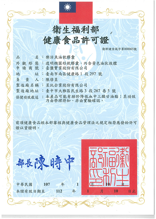 健康食品認證:本產品可能有助於降低血中三酸甘油酯;其功效乃由學理得知,非由實驗確認